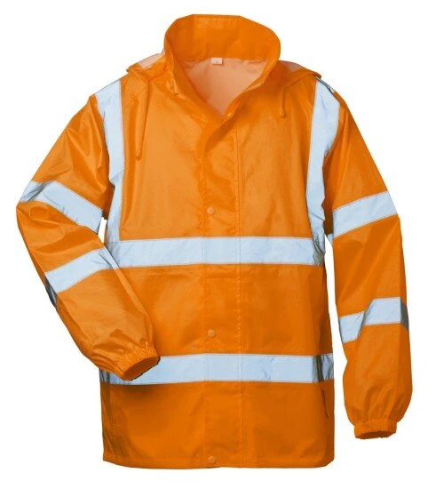 Regenhacke Warnschutz HAUKE von Safestyle in fluoreszierendem orange. Diese Warnschutzjacke ist aus robustem Oxford Gewebe gefertigt und hat einen verdeckten Reißverschluss damit keine Nässe eindringen kann. Die Kapuze im Kragen ist abnehmbar.